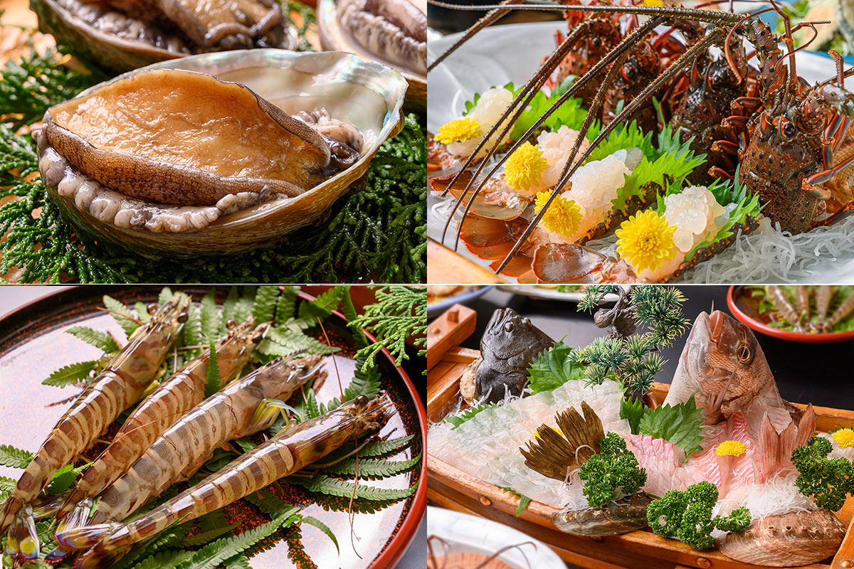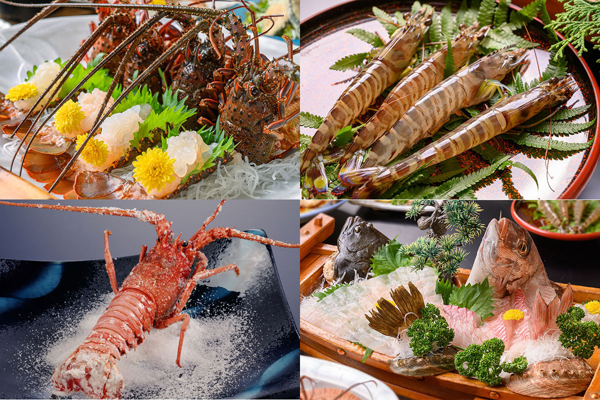 ※伊勢海老のお造りを【あわびの踊り焼き】または【和牛の石焼】へ変更できます。ご予約の際にお伝えください。
